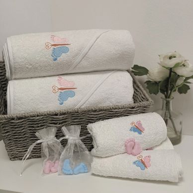 We supply our washcloths with pink or blue foot print soaps which are fragrances with baby powder, and can be paired with our soft towels for families to keep .